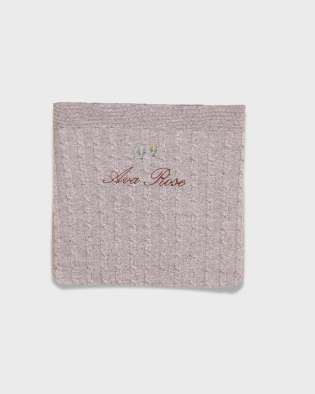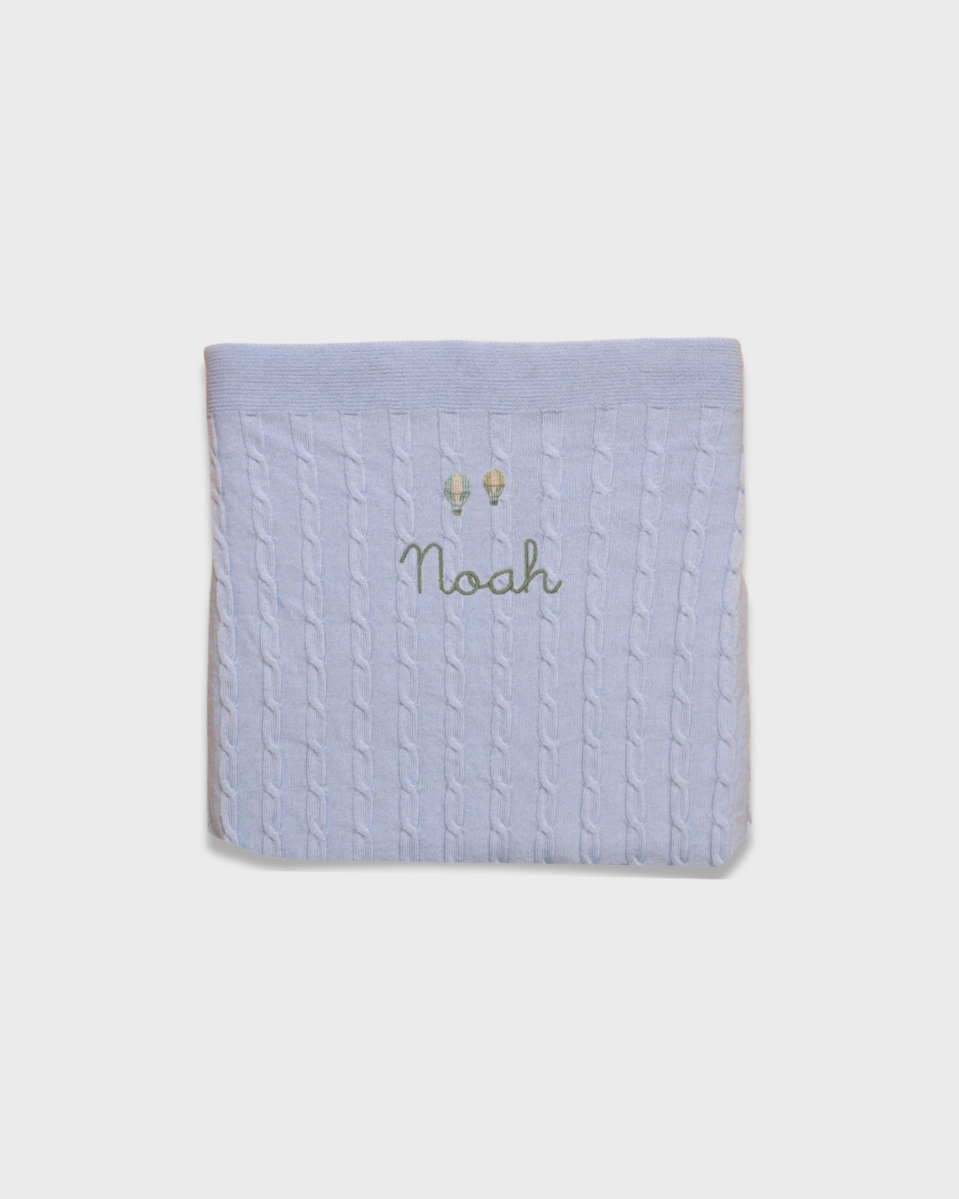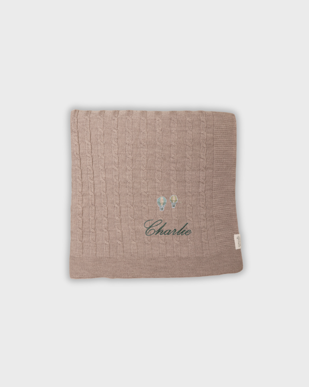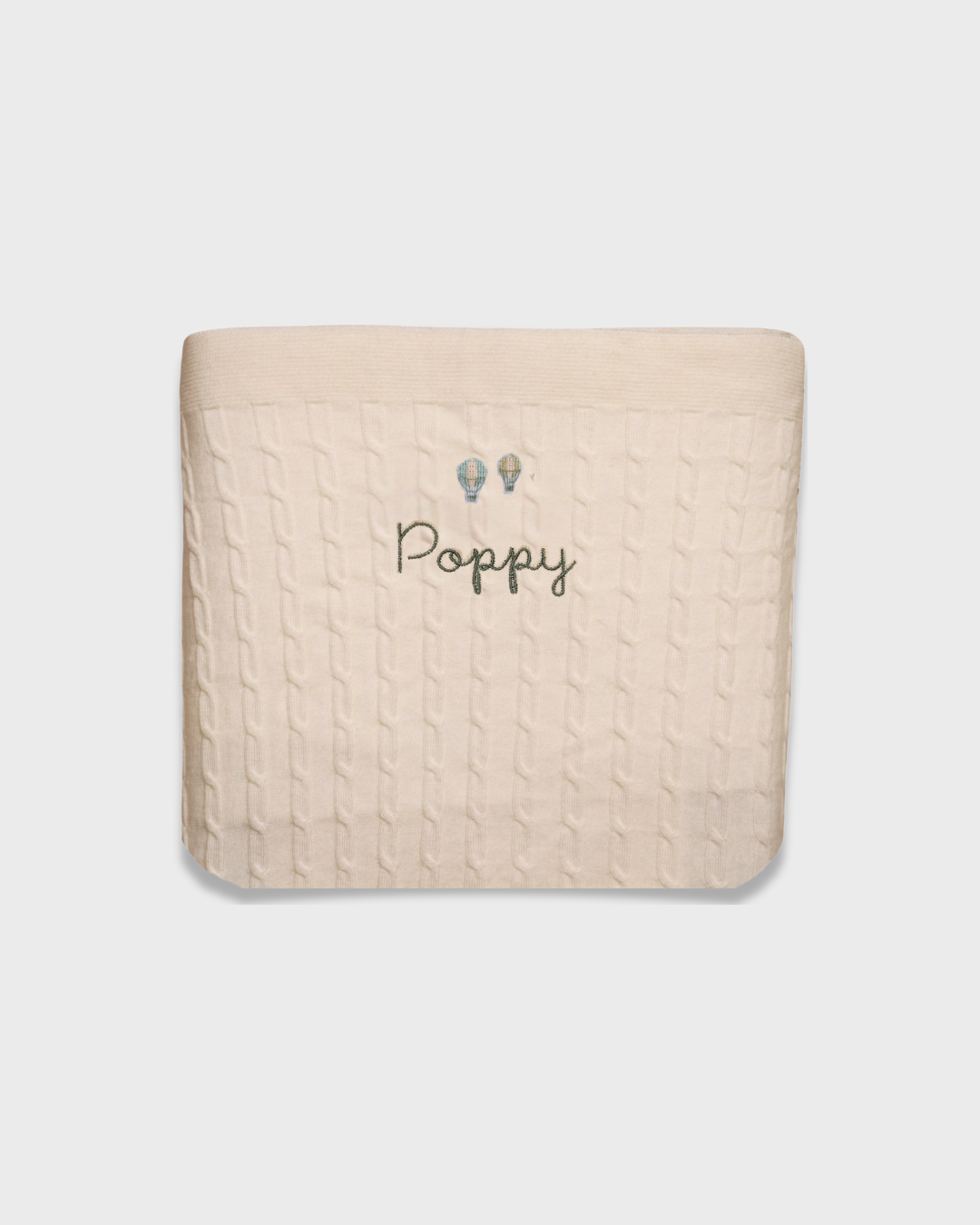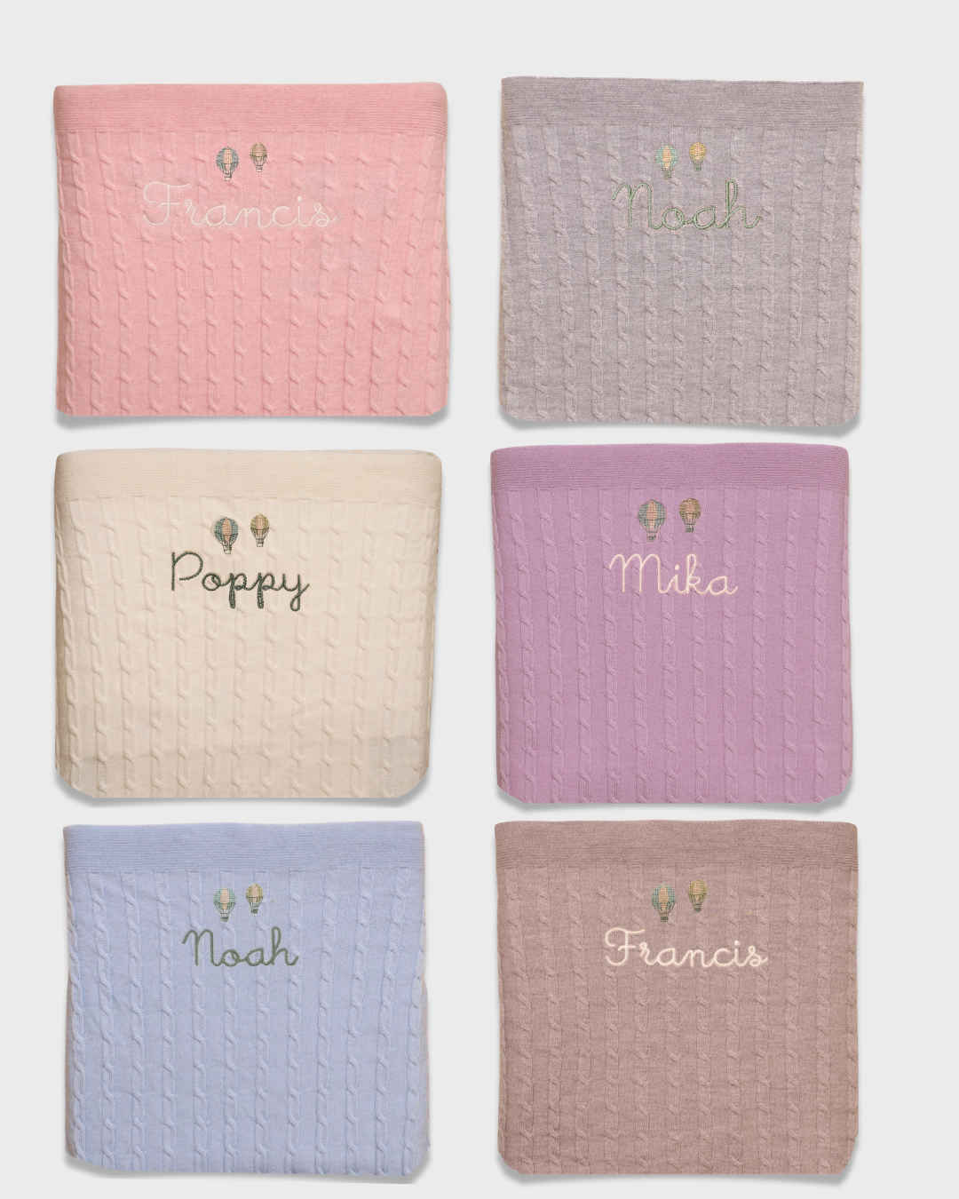 Embroidery: Your personalisation is embroidered below beautiful vintage inspired hot air balloons floating above in a cross stitch embroidery for a nostalgic touch.
