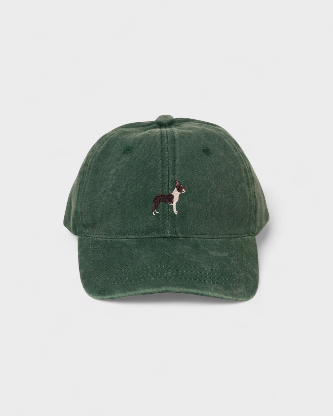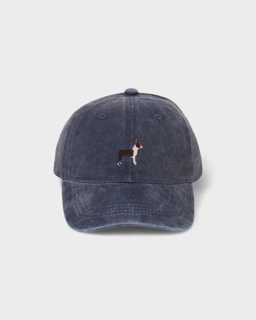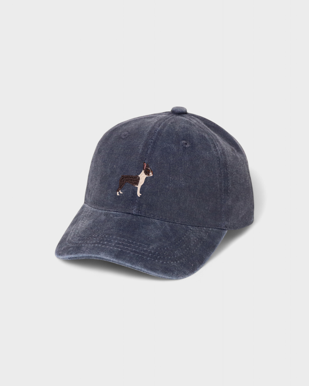 Boston Terrier personalised hat with custom embroidery, featuring hand-drawn design on washed cotton.