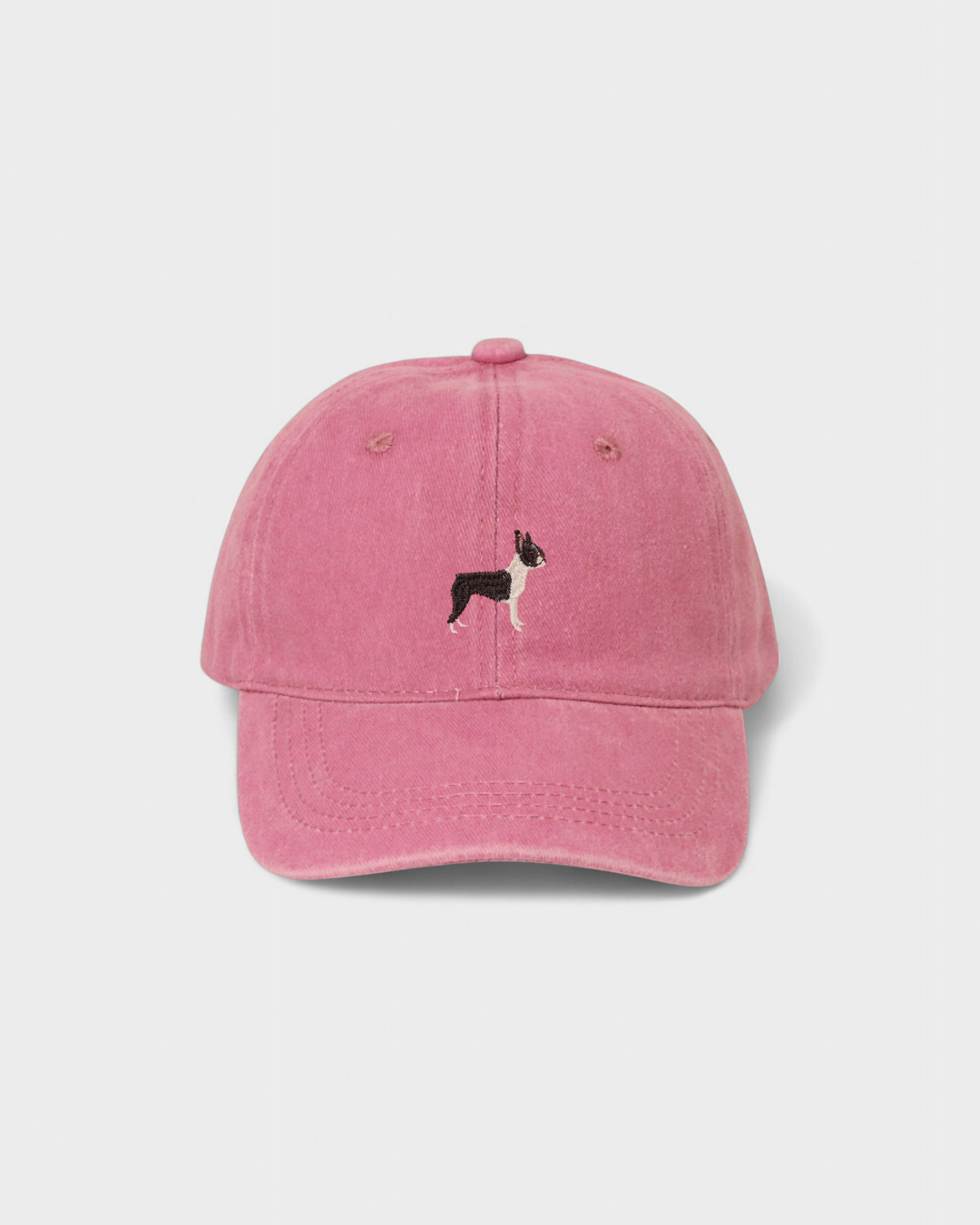 Personalised Boston Terrier embroidered hat in pink with custom back embroidery option.
