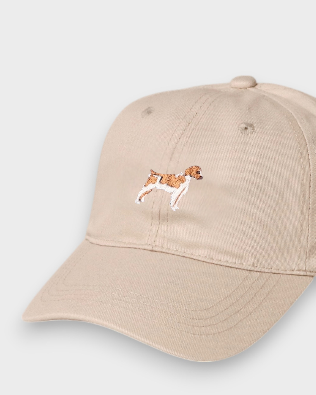 Brittany Spaniel Personalised Hat with hand-embroidered dog design on beige washed cotton baseball cap