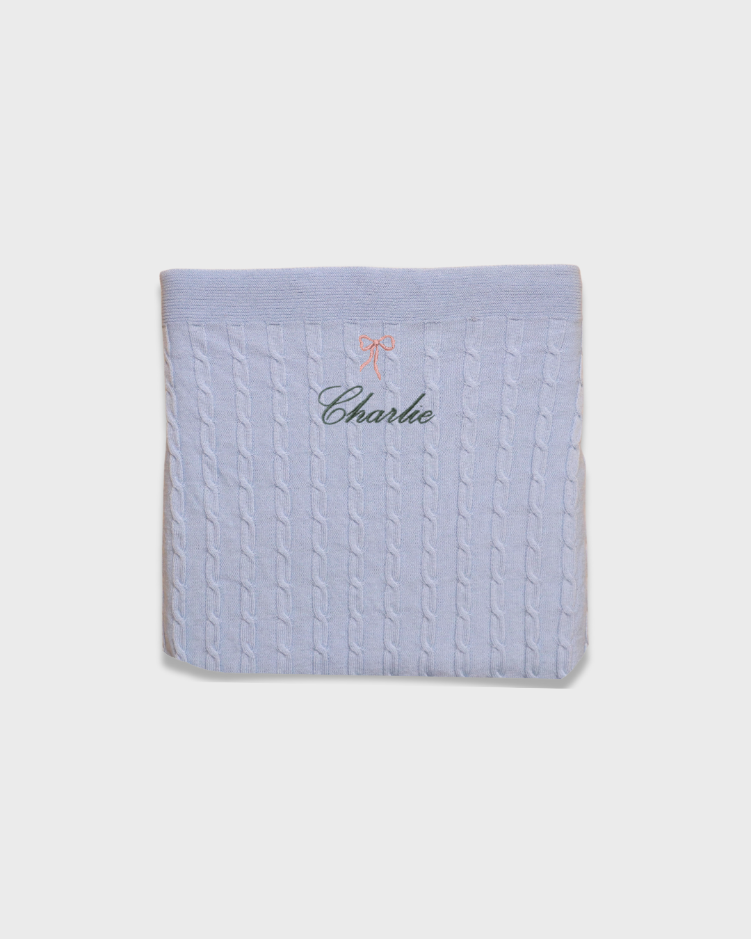 Personalized merino baby blanket with embroidered vintage bow and name "Charlie" in soft wool fibers