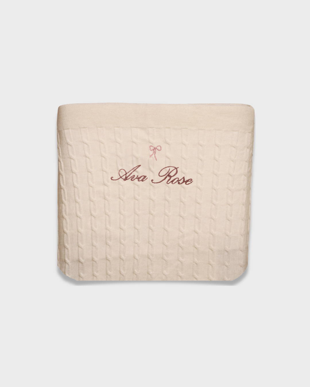 Merino baby blanket with embroidered bow and personalized name in soft cream wool