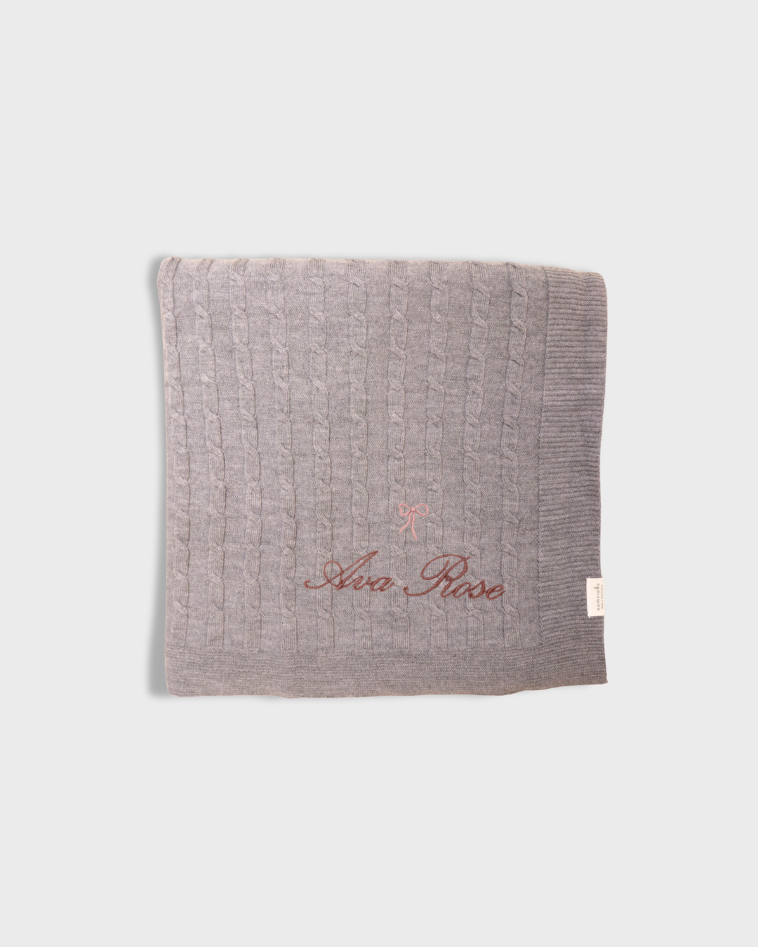 grey merino baby blanket with embroidered vintage bow and personalized name