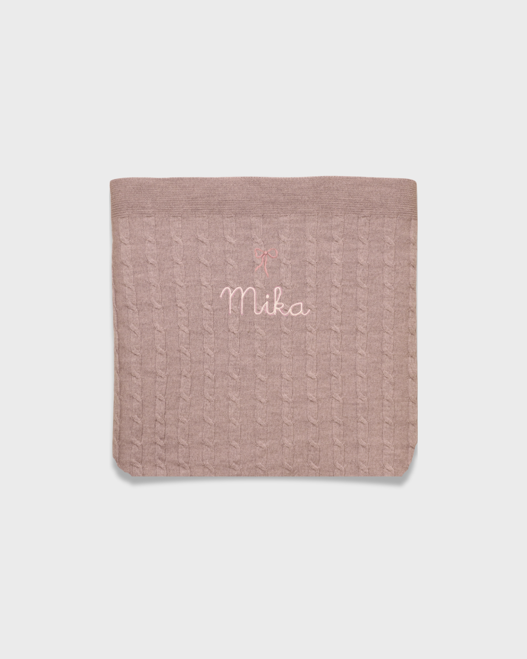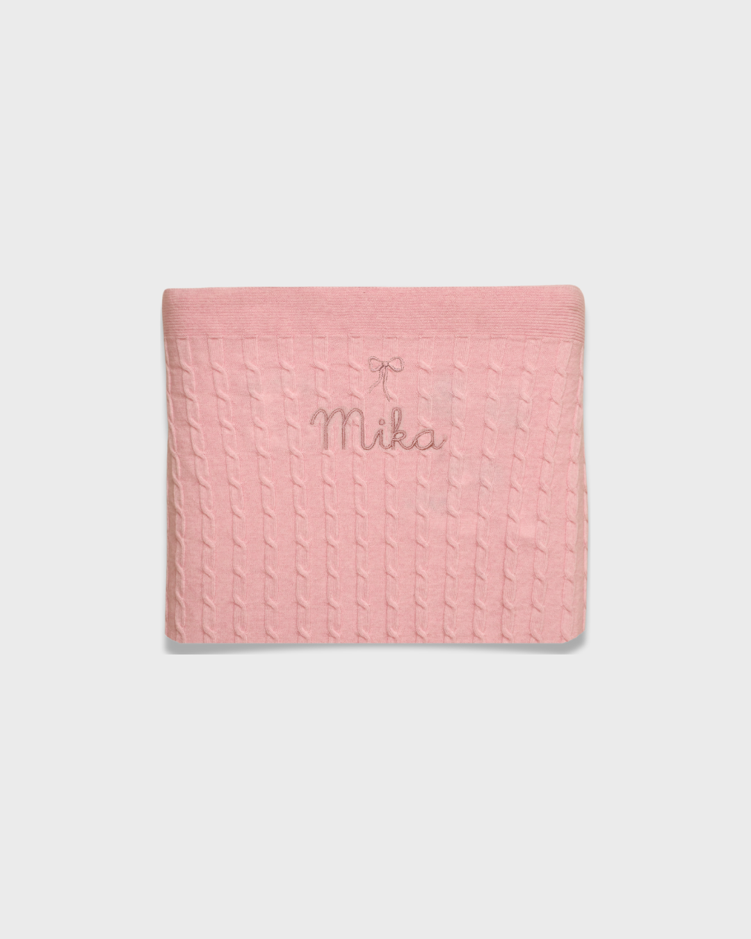 Soft pink merino baby blanket with embroidered name and vintage bow design