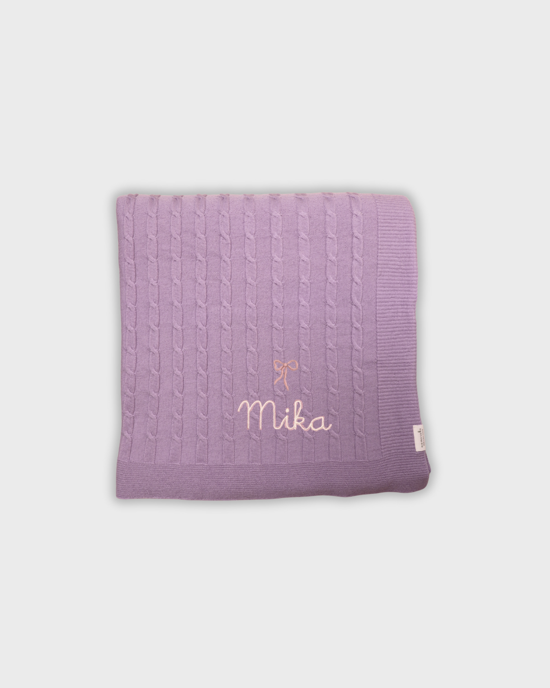 Soft purple Merino baby blanket with embroidered vintage bow and personalized name "Mika"