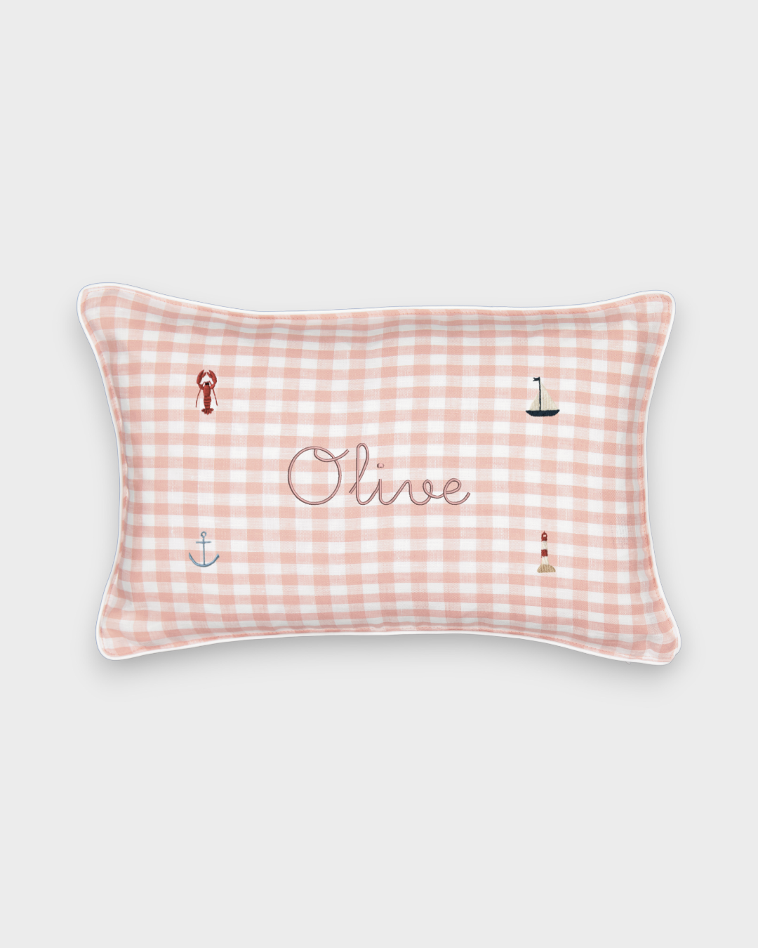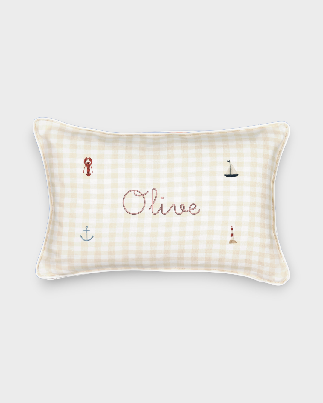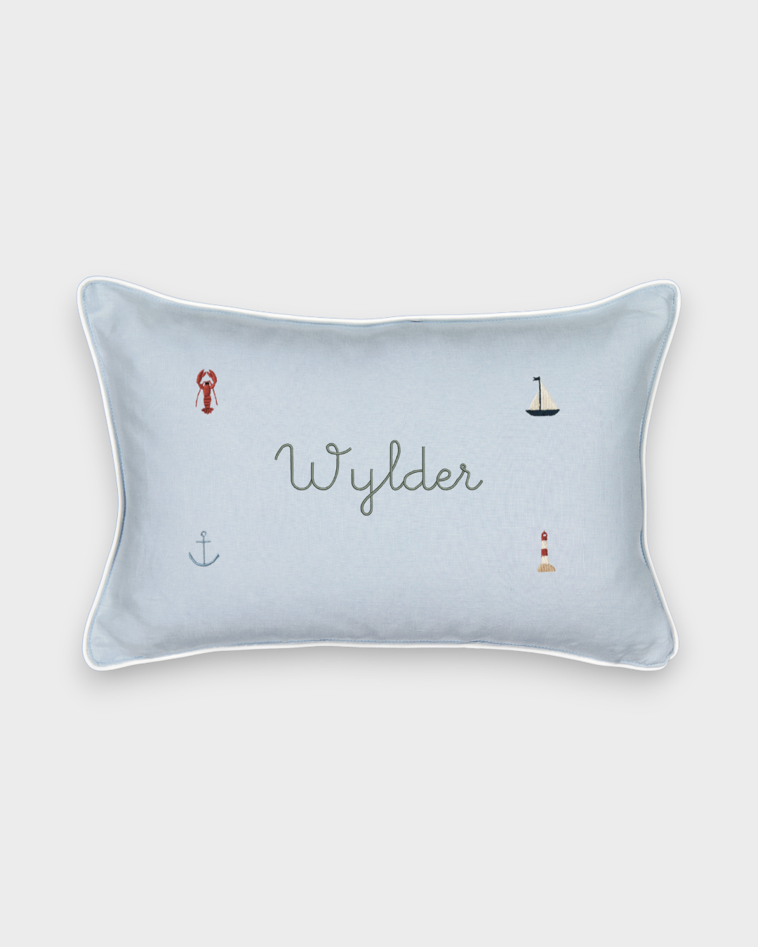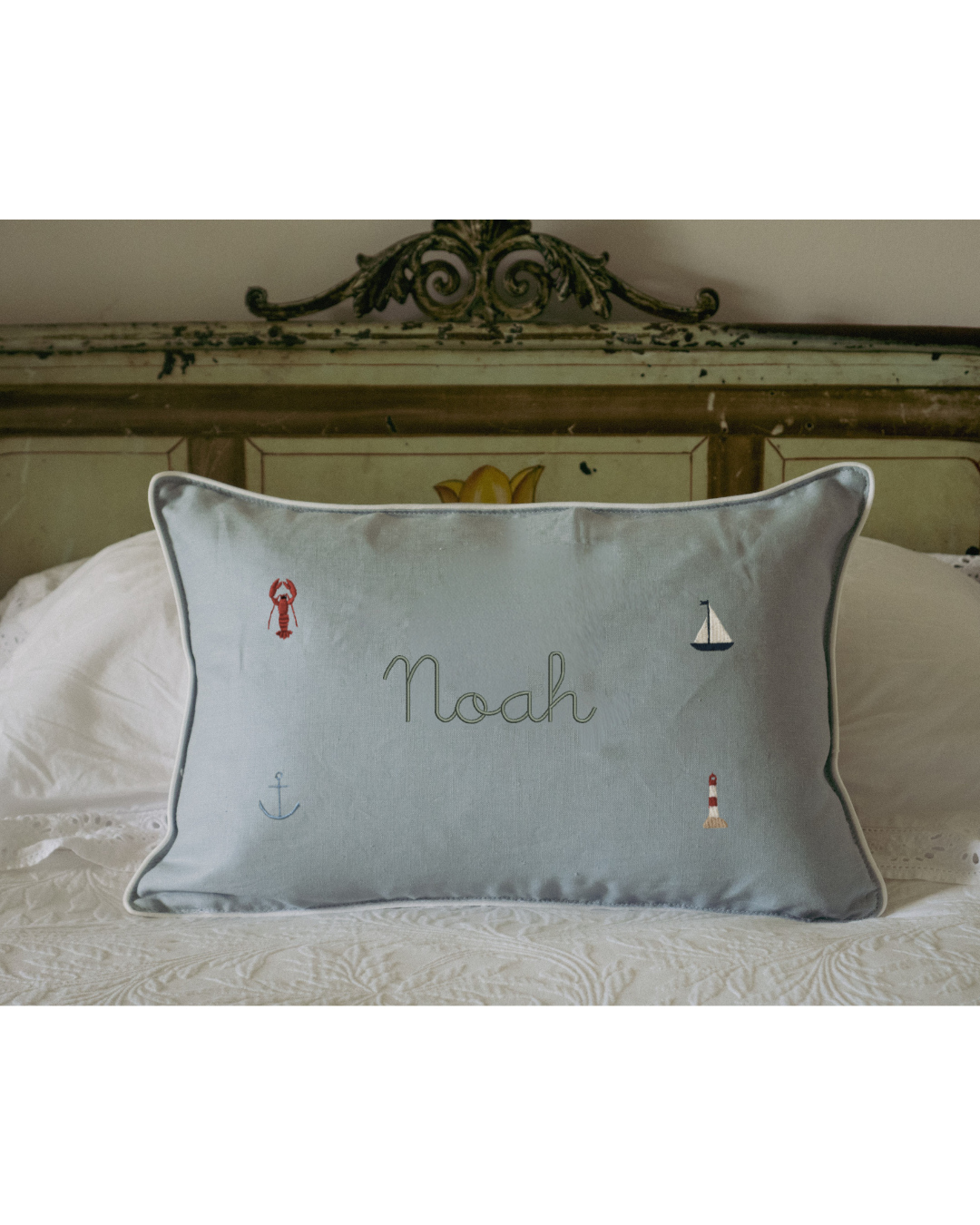 Nautical Keepsake Cushion features detailed needlework of hand-drawn designs of whimsical elements of life at sea.