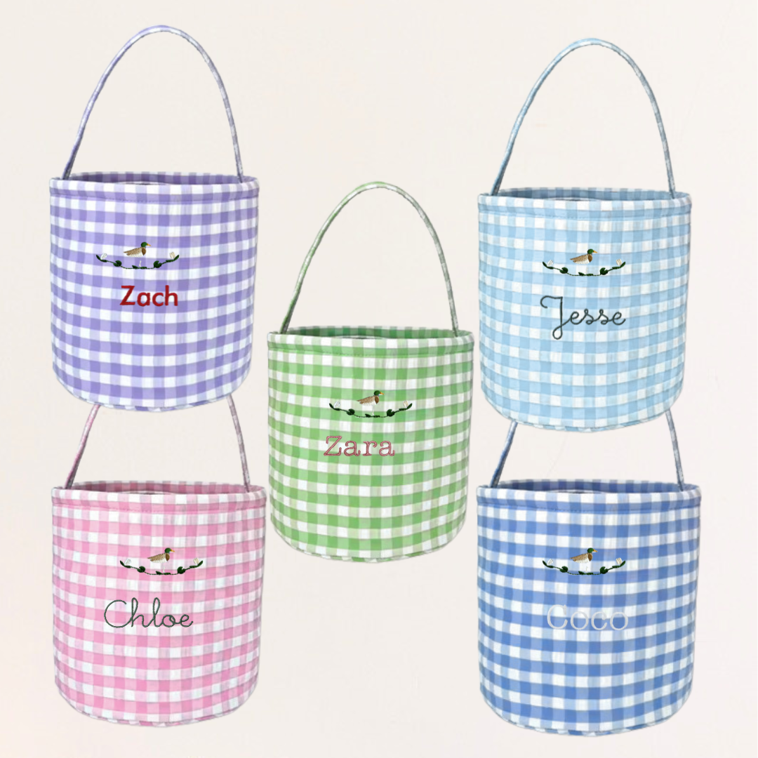 Multicolored gingham personalised Easter buckets with hand-drawn embroidery in various styles.