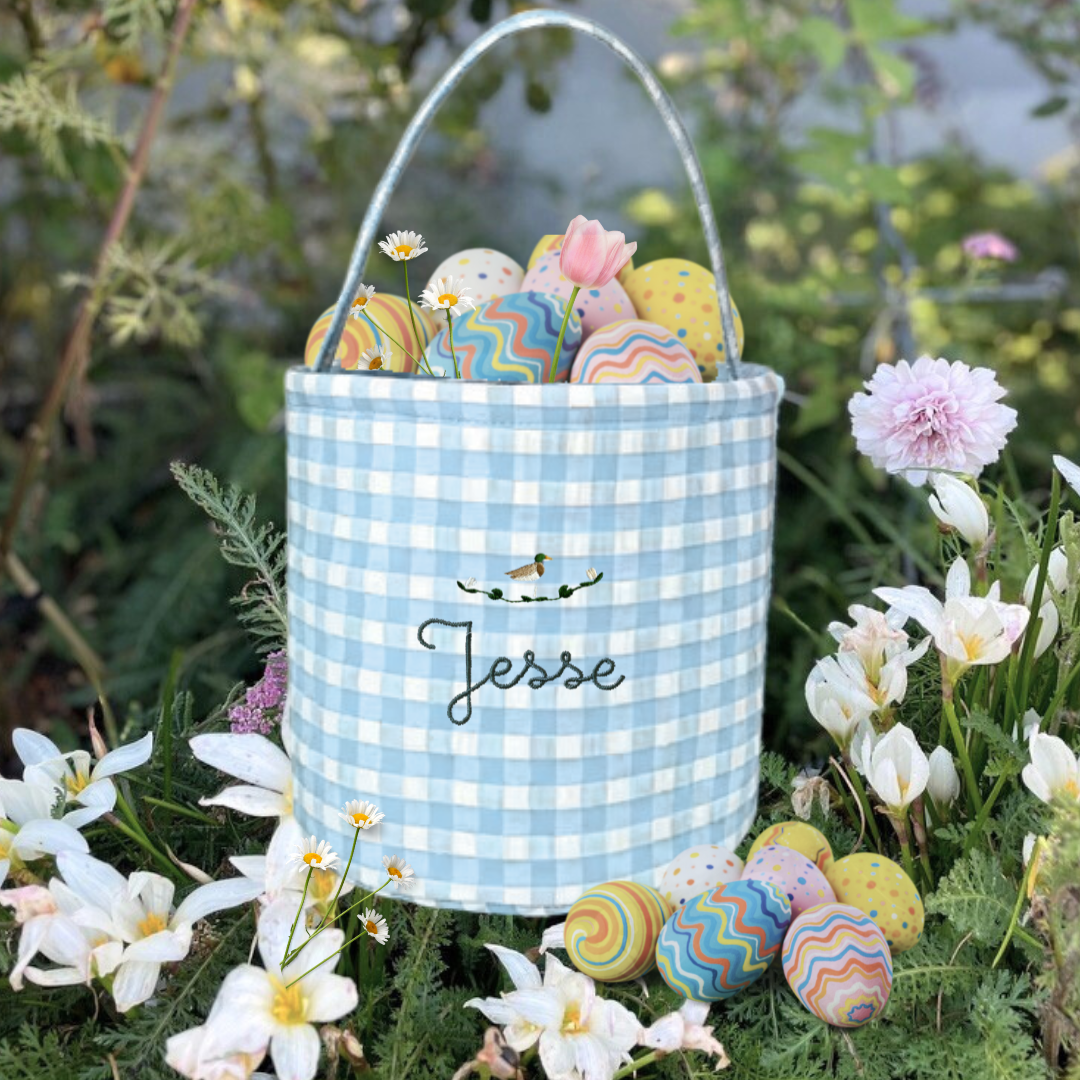 Personalised Easter bucket with gingham design and hand-drawn embroidery.
