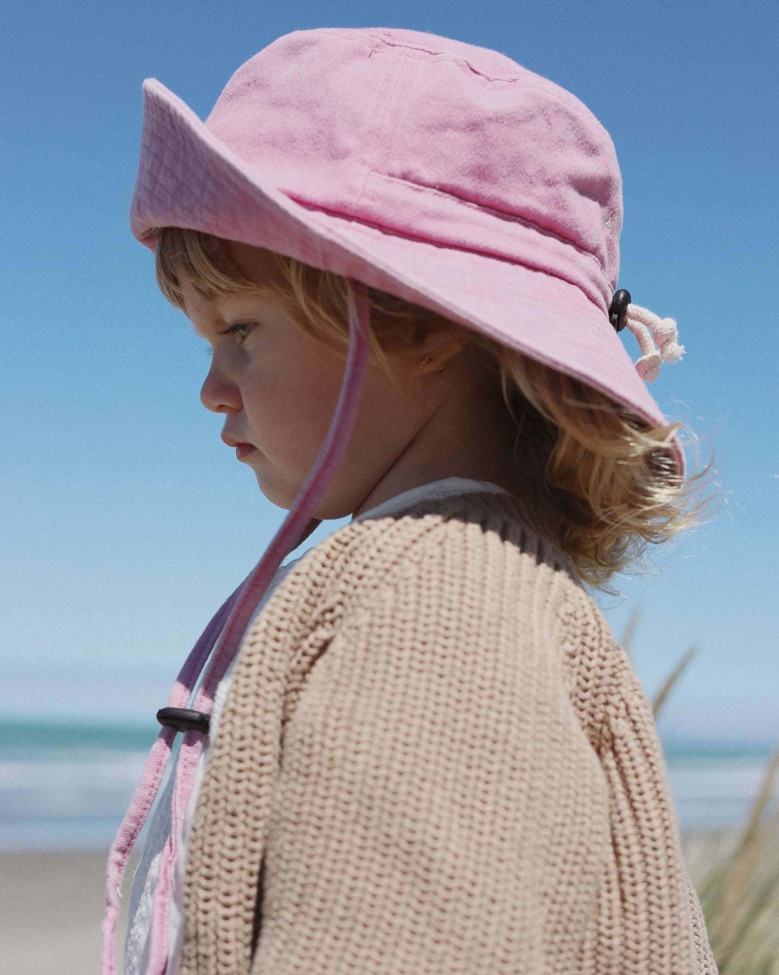 Our embroidered bucket hats are made of 100% washed cotton for a soft, comfortable fit. They are best suited to fit approximately 2-6yo.