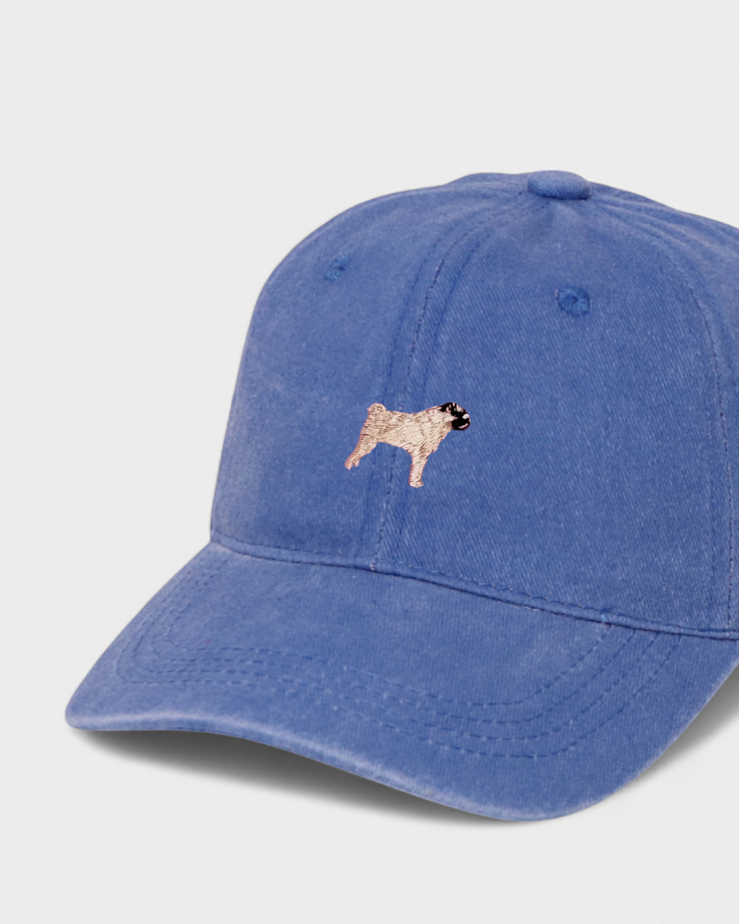 Blue washed cotton baseball hat with hand-embroidered pug design and customizable back embroidery
