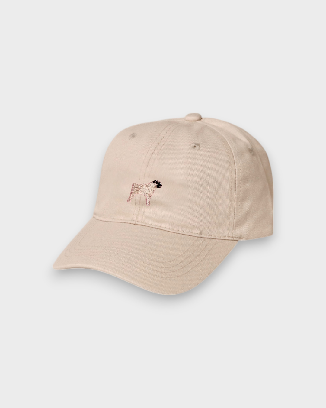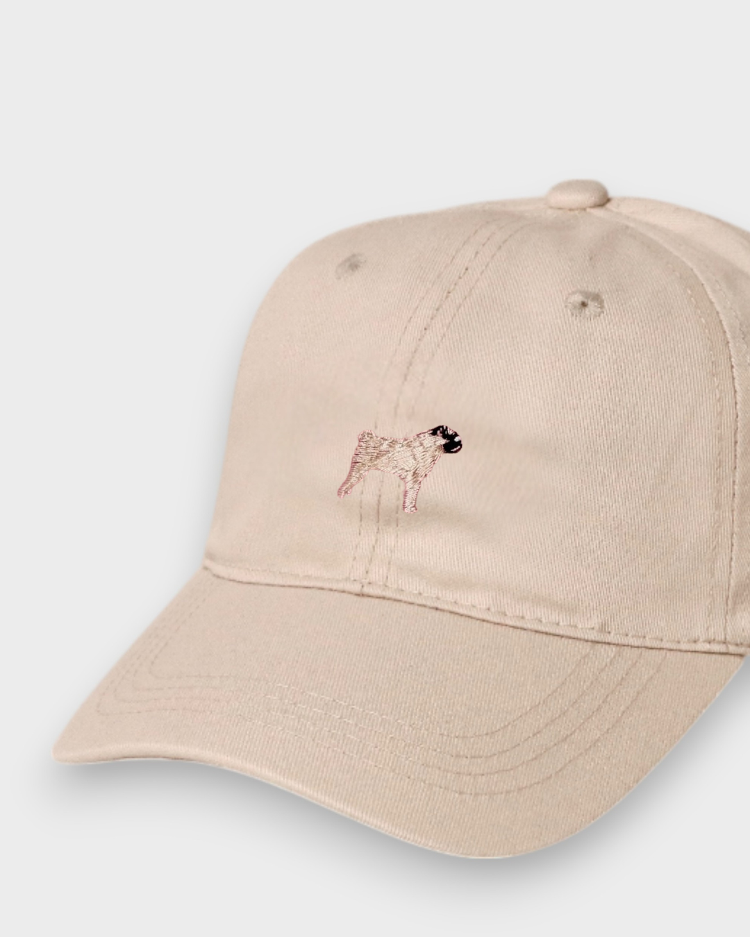 Beige Pug Personalised Hat with hand-drawn embroidered pug design on front, made of 100% washed cotton in classic baseball style.