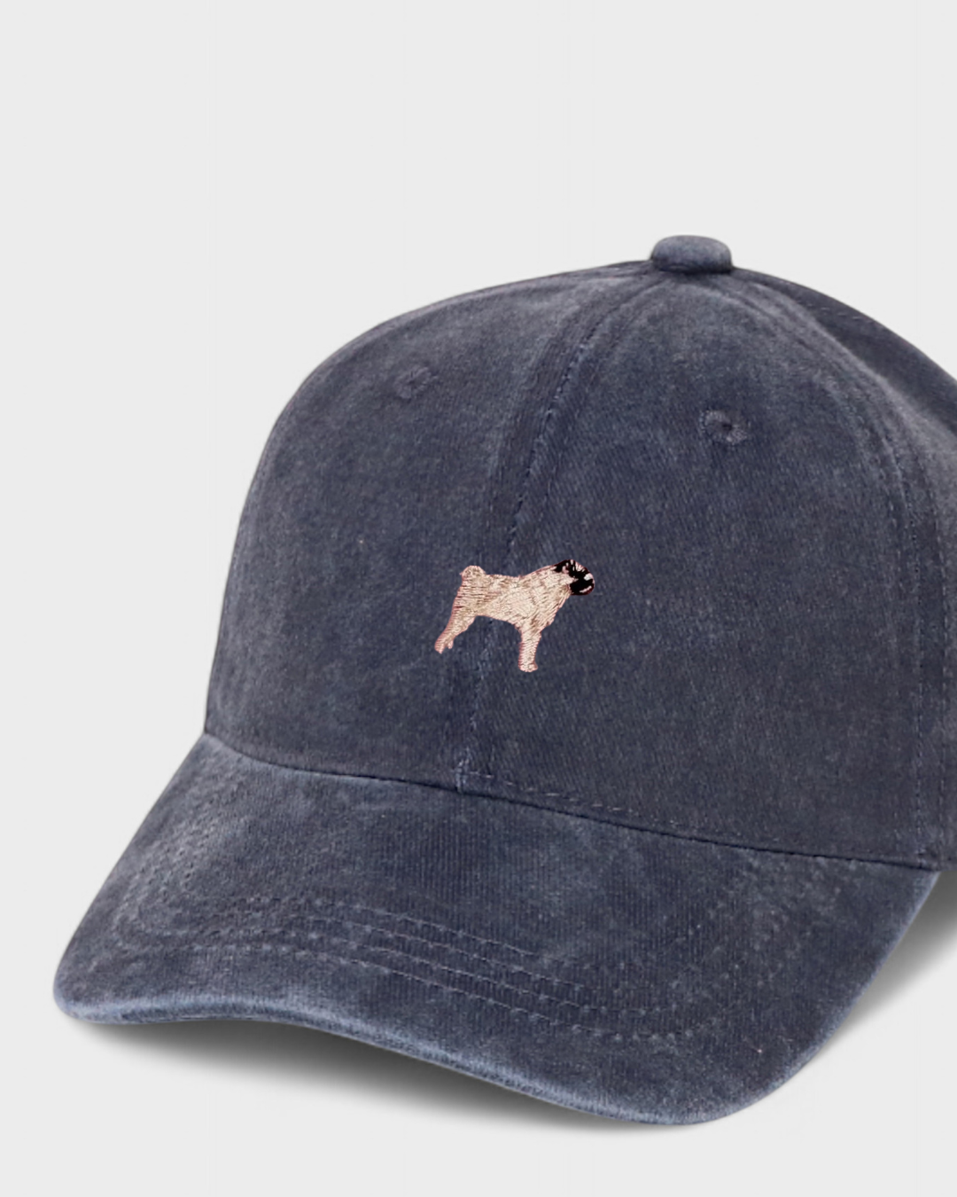 Navy washed cotton baseball cap with embroidered hand-drawn pug design, personalised embroidery option on the back.