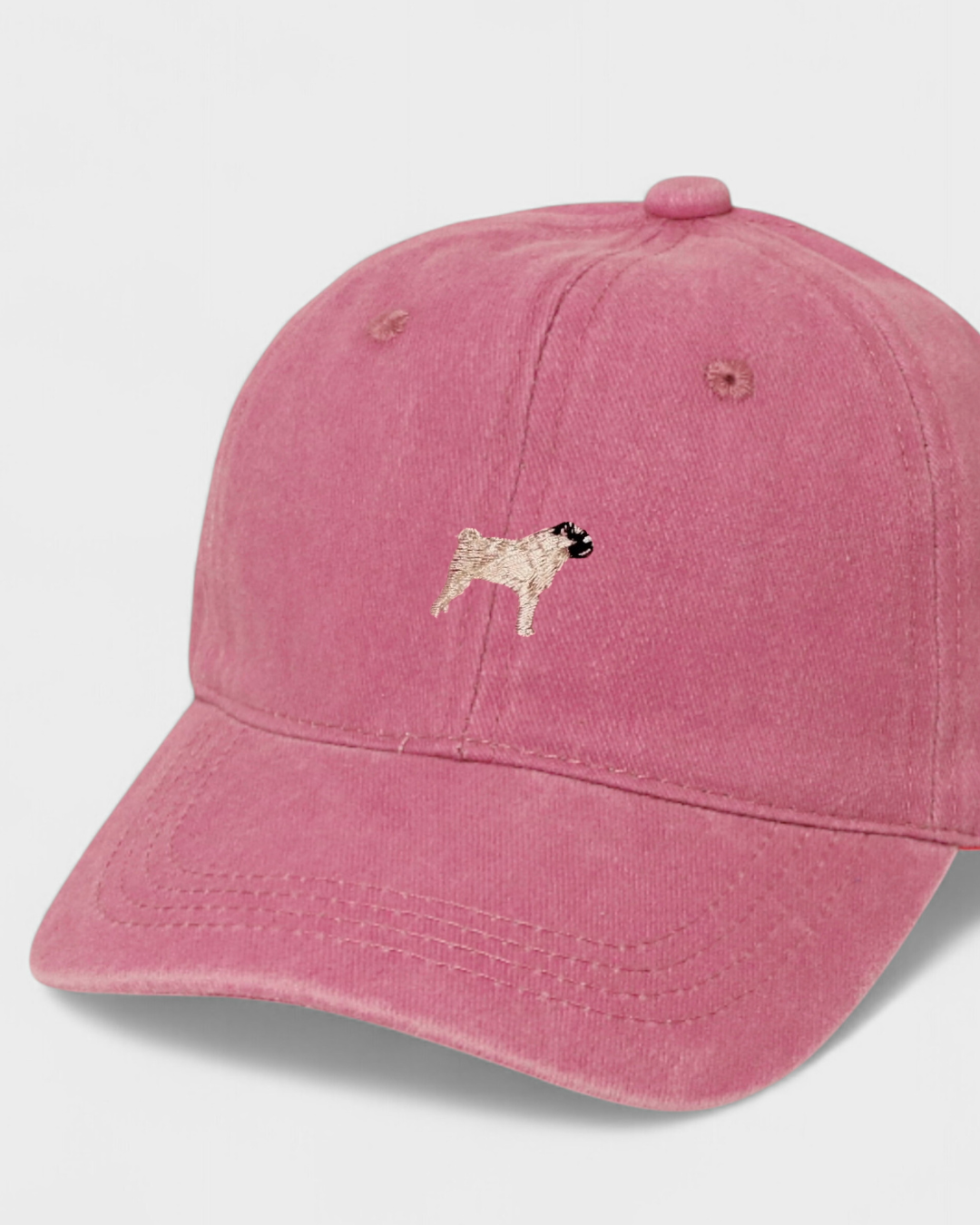 Pink Pug Personalised Hat with embroidered pug design on front made of washed cotton in classic baseball style