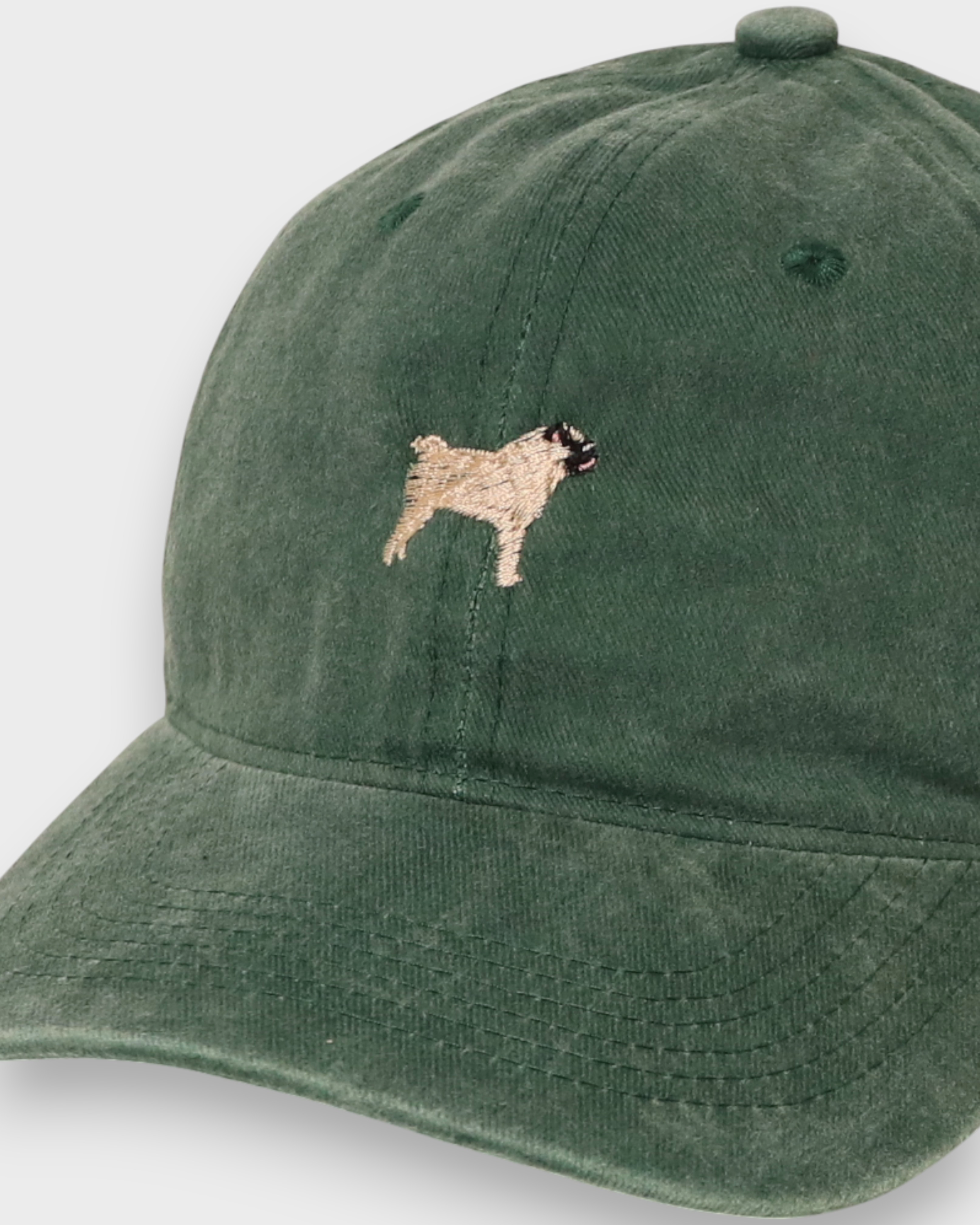 Green Pug Personalised Hat with embroidered hand-drawn pug design and customizable back embroidery in washed cotton baseball style
