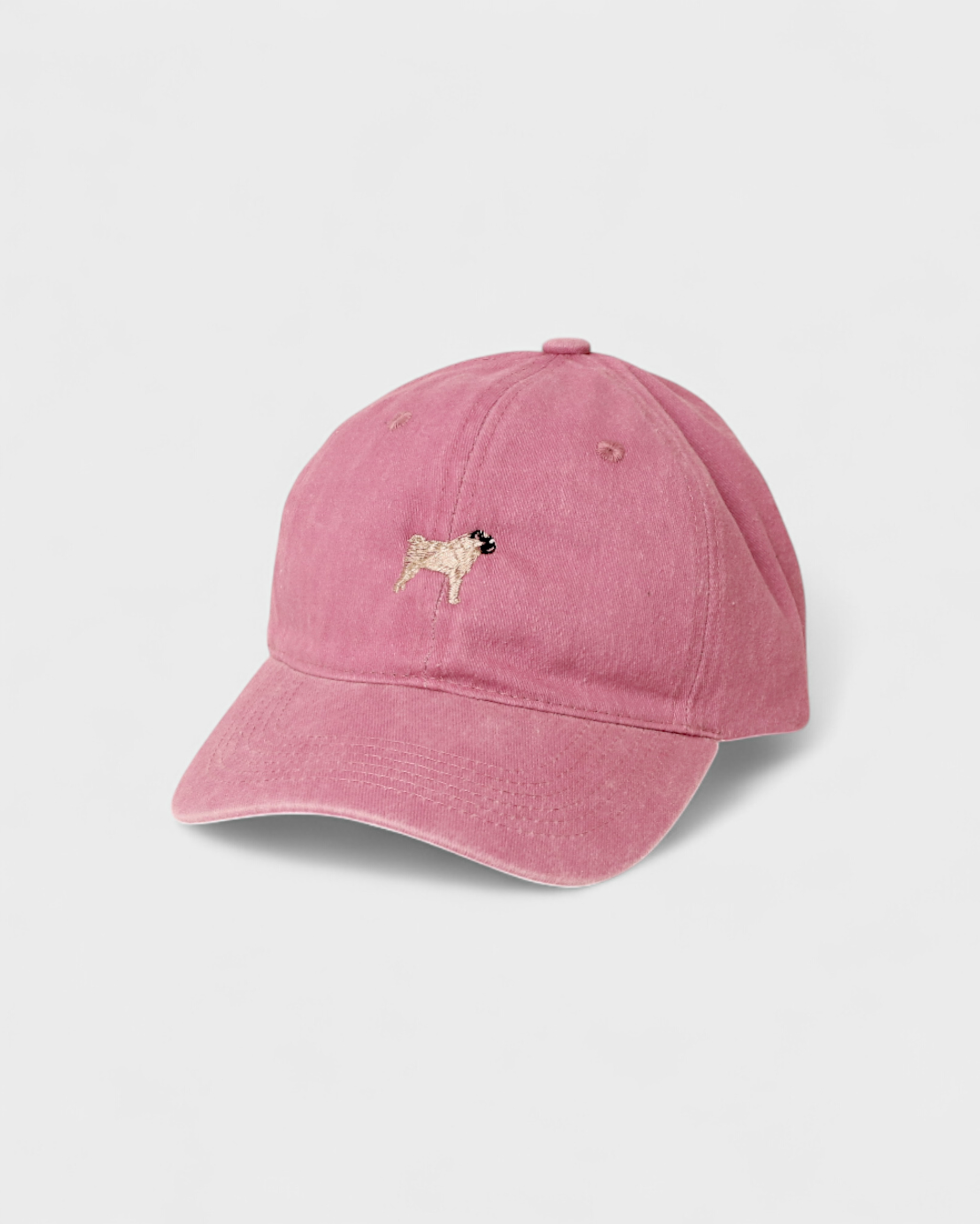 Pink Pug Personalised Hat with embroidered hand-drawn pug design on front, made of 100% washed cotton in classic baseball fit.