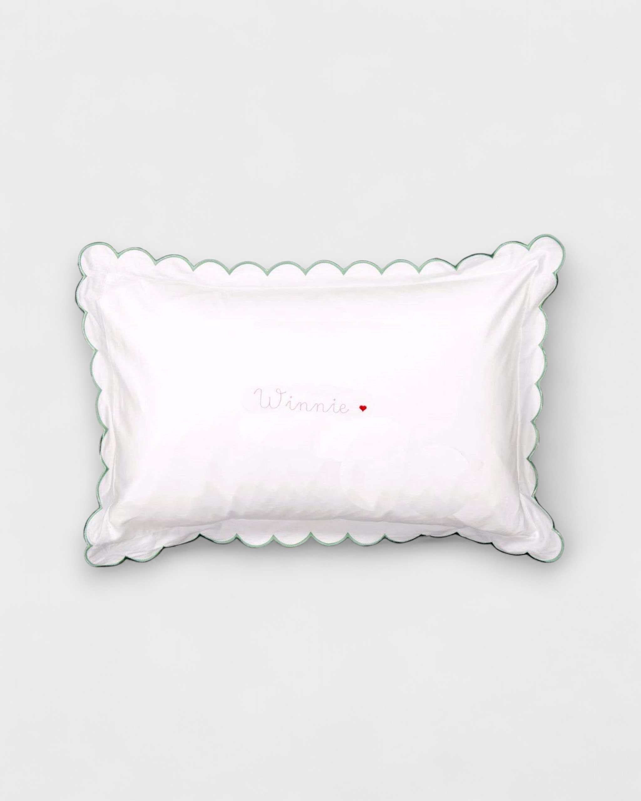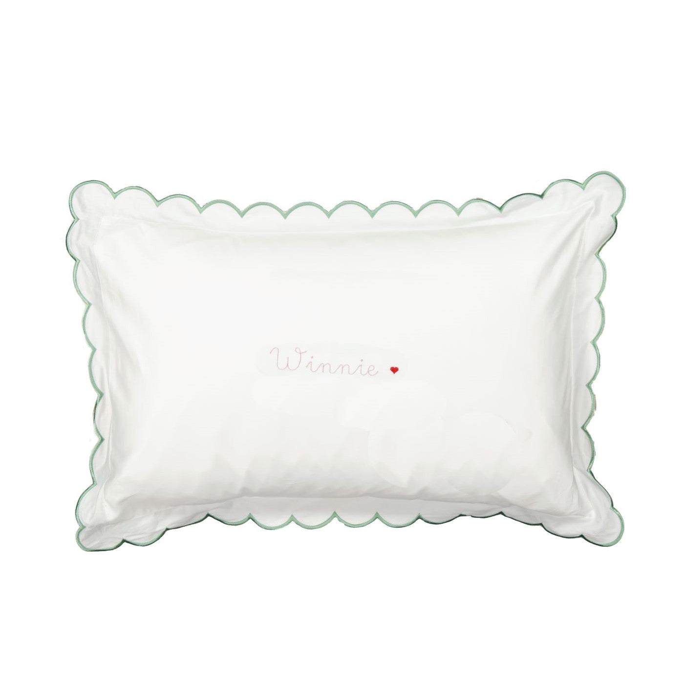 Organic Cotton Pillowcase with Beautiful embroidered scalloped edge detail in light sage green. Personalise with up to two lines of embroidered text.